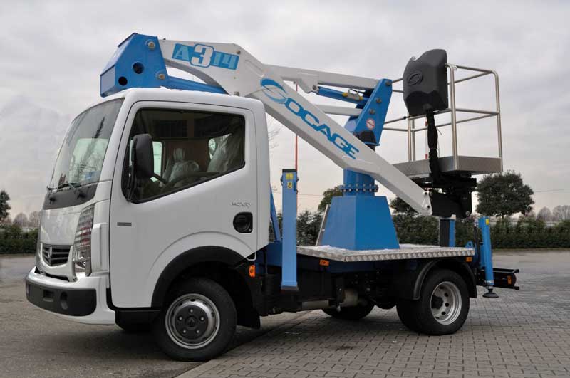 A314 instalada en vehiculo Nissan Cabstar/Renault Maxity es una plataforma aérea articulada desarrollada para el sector del alquiler sin operador. Capaz de llegar a una altura de trabajo de 13,7 m, y con un alcance lateral de 7,1 mts, tiene una capacidad de carga de 225 kgs (2 operadores + material), sin limitación en toda el área de trabajo. El sistema de estabilización en ságoma, minimiza las dimensiones de la plataforma cuando está estabilizada y permite posicionarla en un aparcamiento de coches, sin invadir las calles. Las dimensiones compactas son seguramente un punto de fuerza de este modelo, ya que mide poco más de 4,5 m de largo, y por lo tanto es similar a un coche station wagon. La rotación de la sobre estructura es continua; esta caracteristica aumenta la productividad de la plataforma evitando el tiempo para el reposicionamiento. La rotación de la cesta en aluminio (dimensiones 1400x700xh 1100 mm) y 90º + 90º.